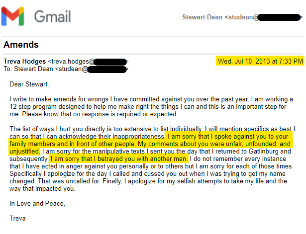 I never thought I would have to deal with any of this. The year after she left, Treva sent me the following email:
